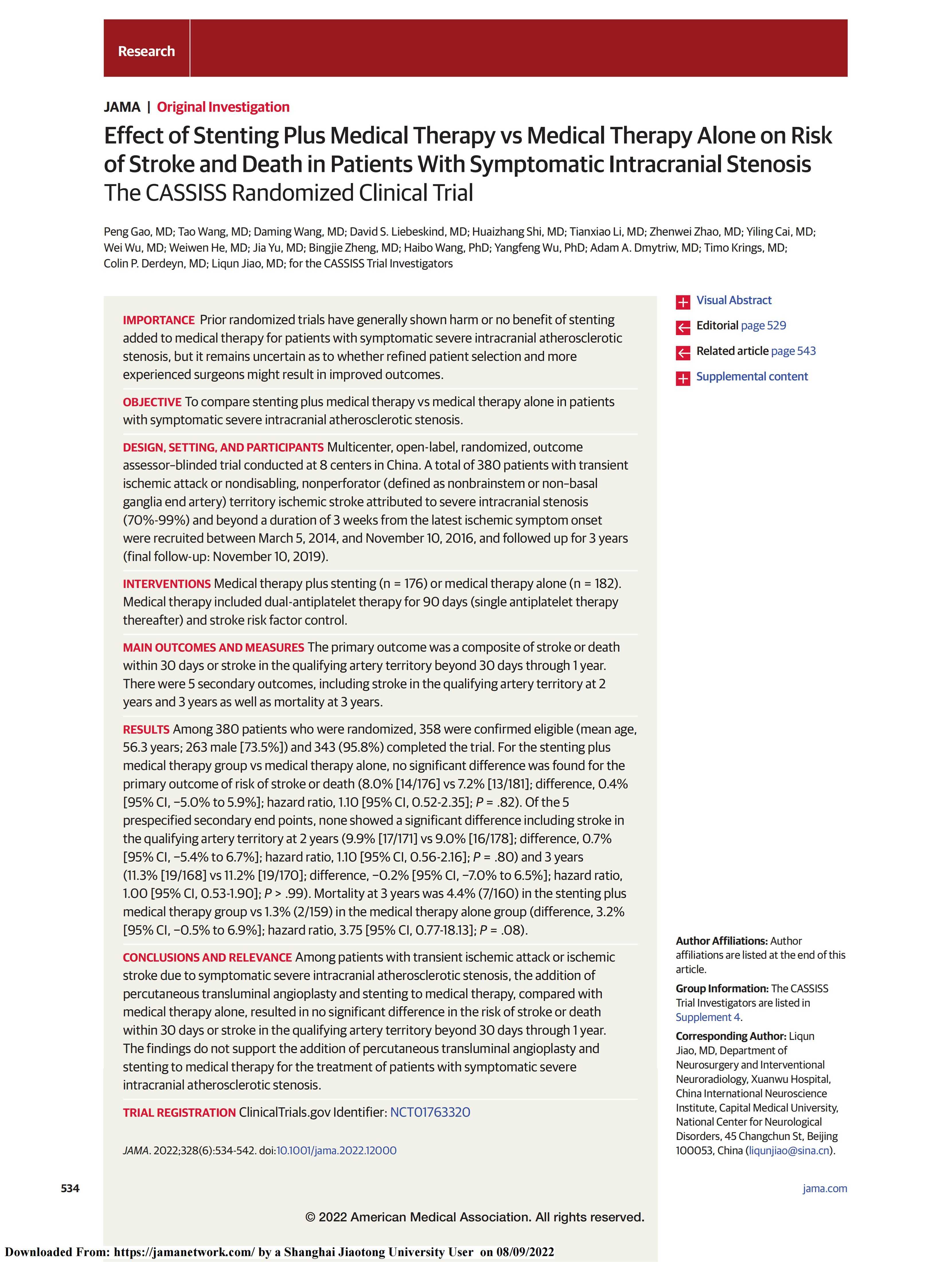 中国神经介入领域第一个关于颅内动脉粥样硬化狭窄介入治疗与药物治疗对比的多中心随机对照试验。共8家三甲医院参与,纳入380例症状性颅内动脉粥样硬化狭窄的患 者,随机按1:1分为介入治疗组和药物治疗组。所有患者均需在基线、入组后第1天、7天、30天、4个月、12个月、24个月和36个月行血管超声、脑血管造影、脑组织灌 注、脑组织和脑血管检查,共采集影像数据2400余例,数十万帧影像资料,分别归类整理,存储和判读。