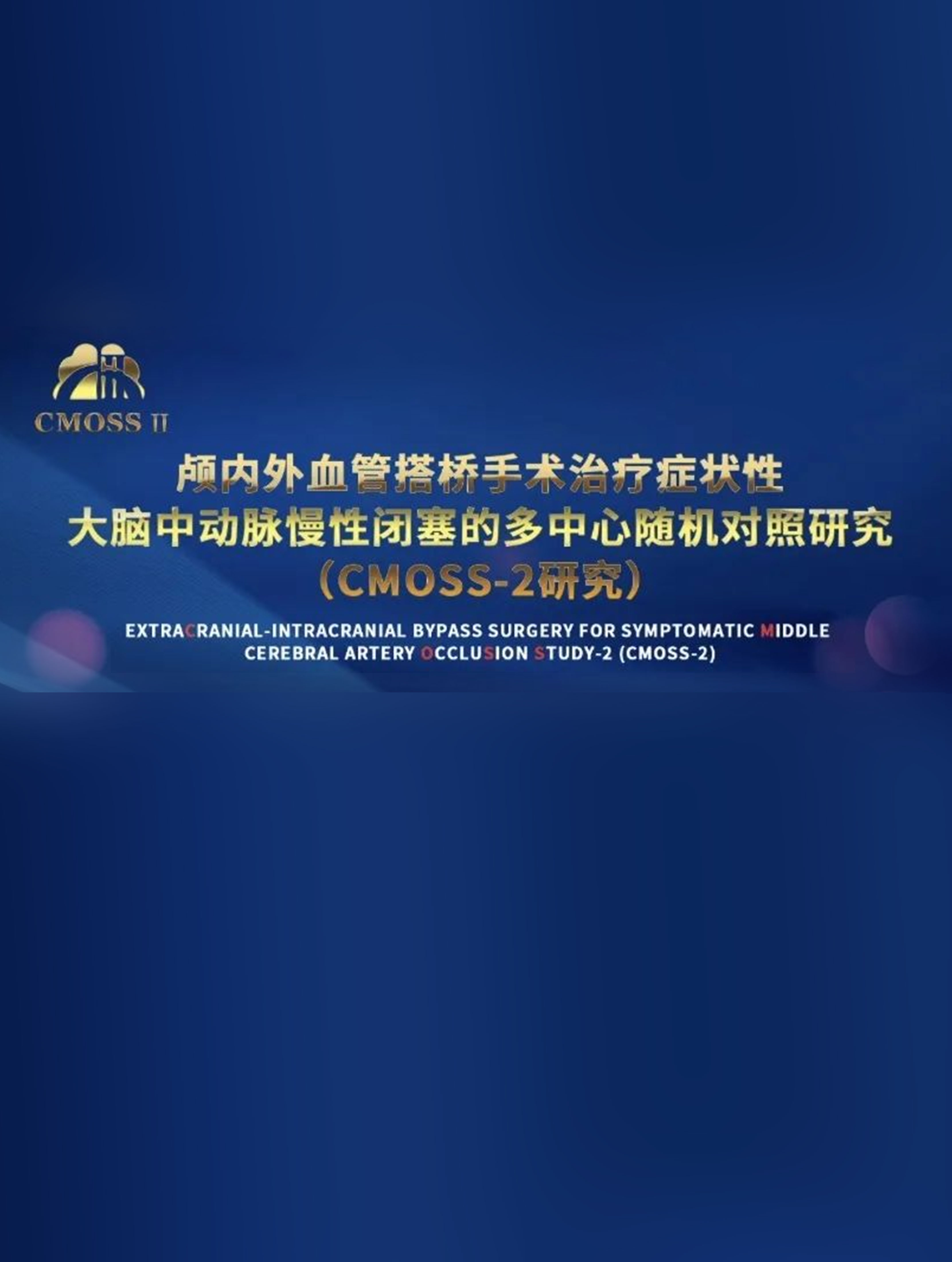 承继中国神经介入领域第一个关于颈动脉或大脑中动脉闭塞搭桥手术治疗与药物治疗对比的多中心随机对照试验(CMOSS 研究)的二期试验。共由12家中国三甲医院参与,预计将纳入364例经全脑血管造影确诊为症状性单侧大脑中动脉慢性闭塞患者。患者随机按1:1被分为试验组(颅内外血管直接搭桥手术联合标准药物治疗)和对照组(标准药物治疗)。所有患者需在基线、入组后第7天、30天、6 个月、12 个月和 24 个月行脑血管造影、脑组织灌注、脑组织和脑血管检查。预计采集相关影像数据千余例,数十万帧影像资料,分别进行归类整理,存储和判读。