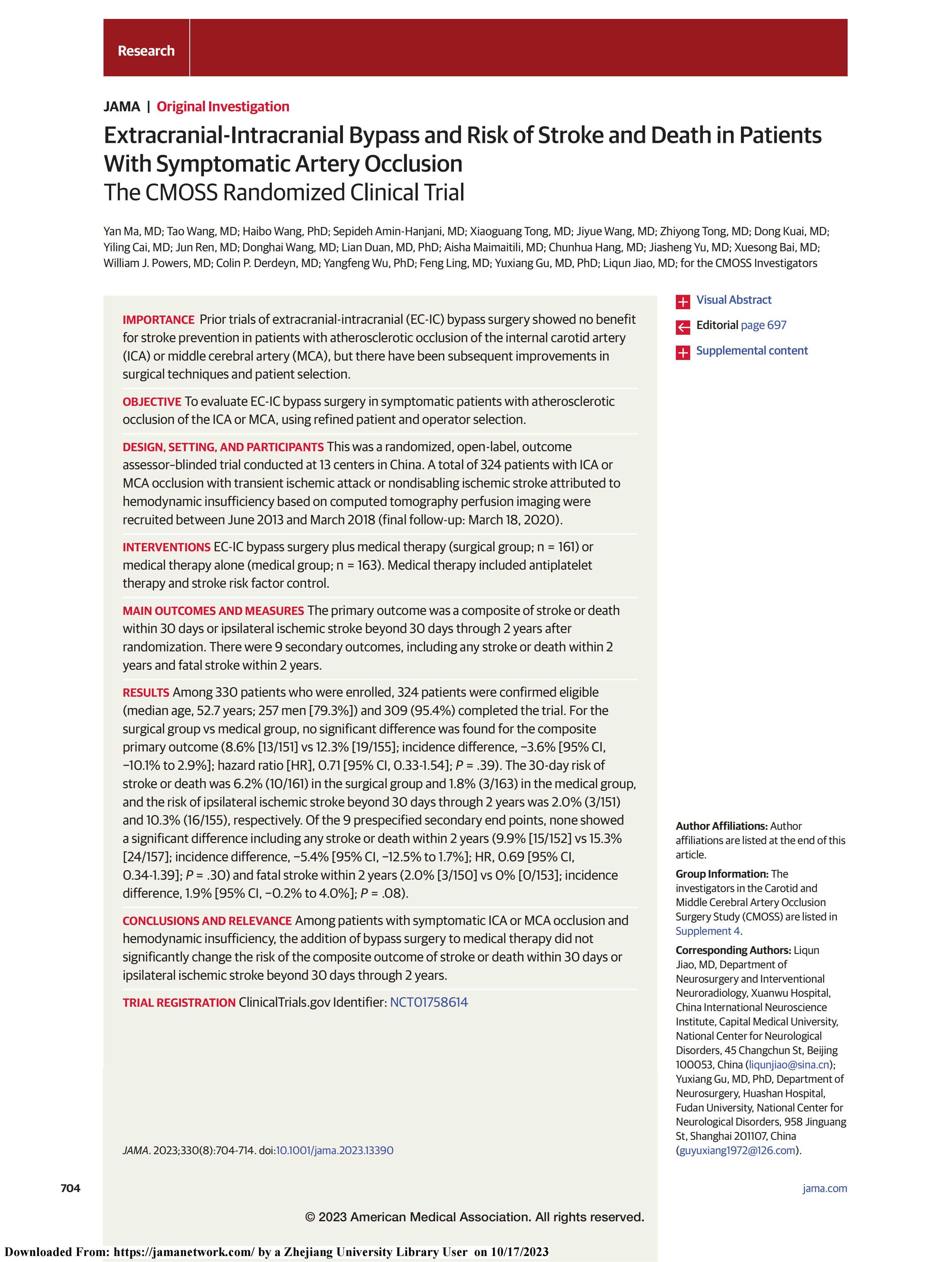 颅内外血管搭桥手术治疗症状性大脑中动脉慢性闭塞的多中心随机对照研究